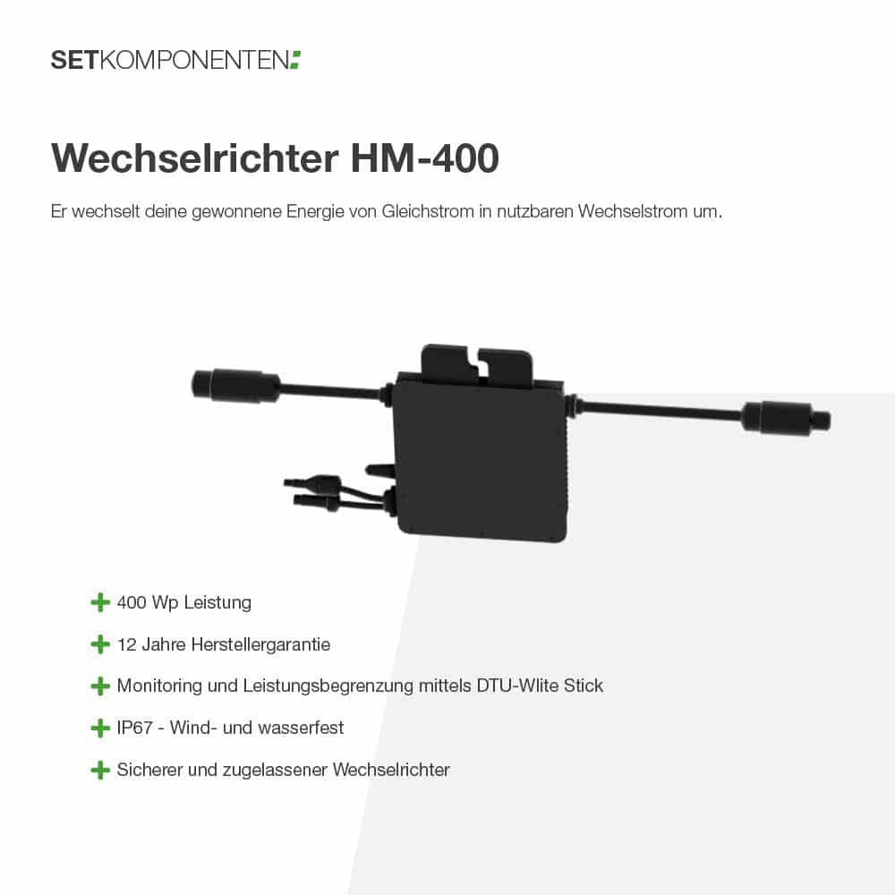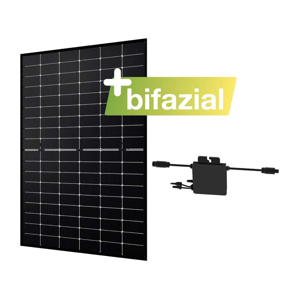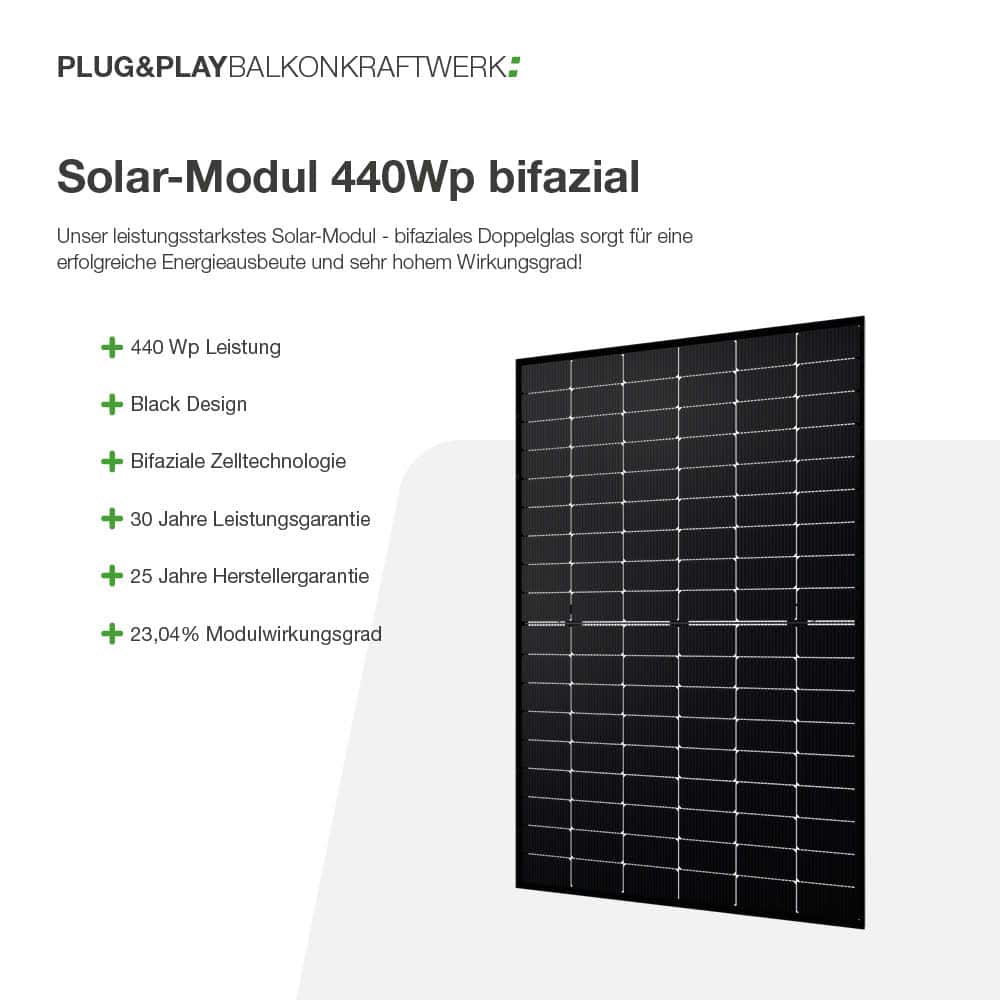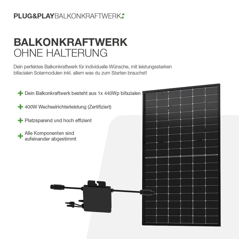 Dein Sonnenkraftwerk für dein Zuhause. Mit PLUG&PLAY hast du in wenigen Minuten deinen eigens hergestellten Strom. Einfach auspacken, aufstellen und anstecken, fertig! Dein Basic-Set besteht aus einem bifazialen Modul mit 440Wp Leistung und einem 400W Micro-Wechselrichter (HM-400). Die notwendigen Anschlusskabel zum Wechselrichter sind natürlich vormontiert. Wähle für den Anschluss an die Steckdose einfach den passenden Netzstecker aus. Alle Basic-Produkte werden ohne Befestigung geliefert, diese kann beim Zubehör dazu ausgewählt werden.